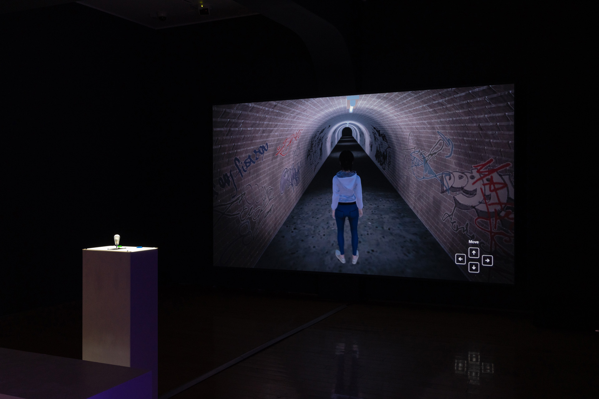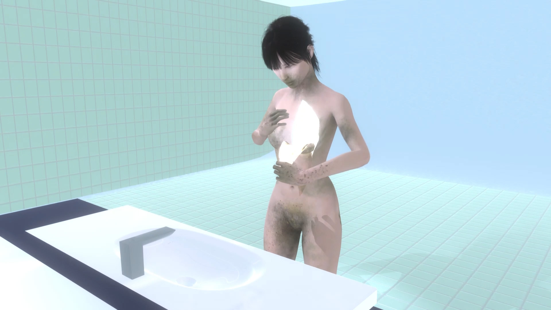 ゲームの中で、鑑賞者はコントローラーを操作し3DCGキャラクターの体を動かすが、被害に遭うと操作が無効になり動けなくなる。